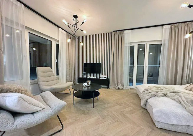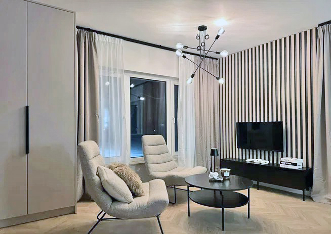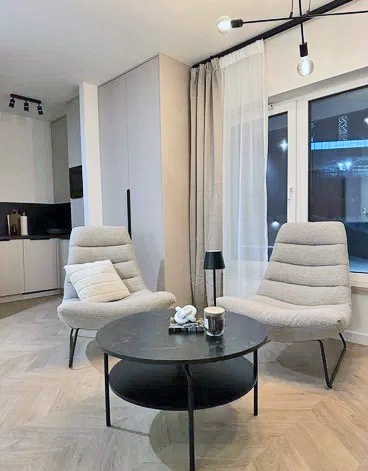 - salon: dwa designerskie fotele, stolik kawowy, RTV, telewizor