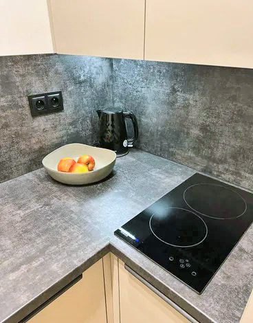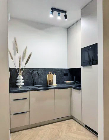 - kuchnia: zabudowa kuchenna pod wymiar zawierająca – lodówkę, zmywarkę, płytę indukcyjną, zlew, mikrofalę z funkcją grilla, okap, stół z krzesłami. Kuchnia jest w pełni wyposażona – sztućce, noże kuchenne, garnki, patelnie, kubki, talerze szklanki, kieliszki do wina, deski do krojenia itd…