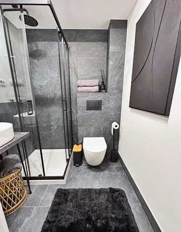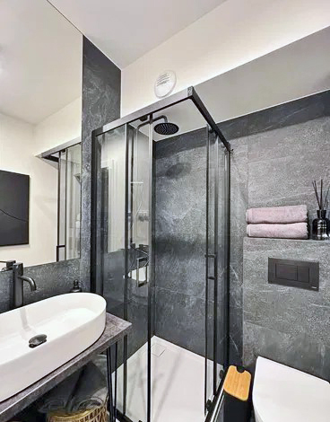 - łazienka: armatura z czarnymi detalami, przesuwna kabina prysznicowa narożna